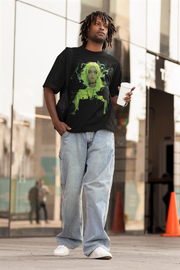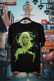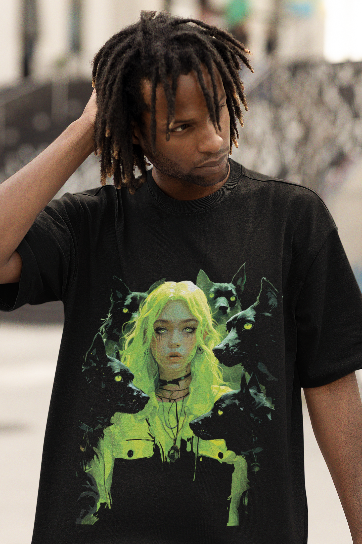 Crafted from ultra-soft premium compact cotton, this black tee offers a luxe feel and an effortlessly structured fit. At the heart of the design is a radiant neon green girl, flanked by two spectral black hounds with glowing green eyes. The contrast? Unmissable. The energy? Undeniable.