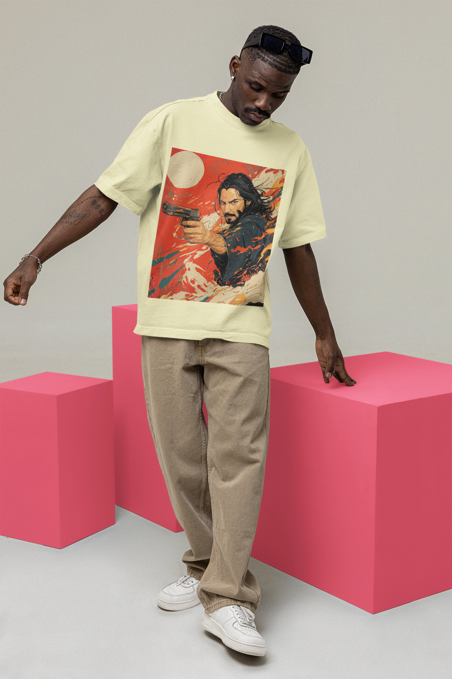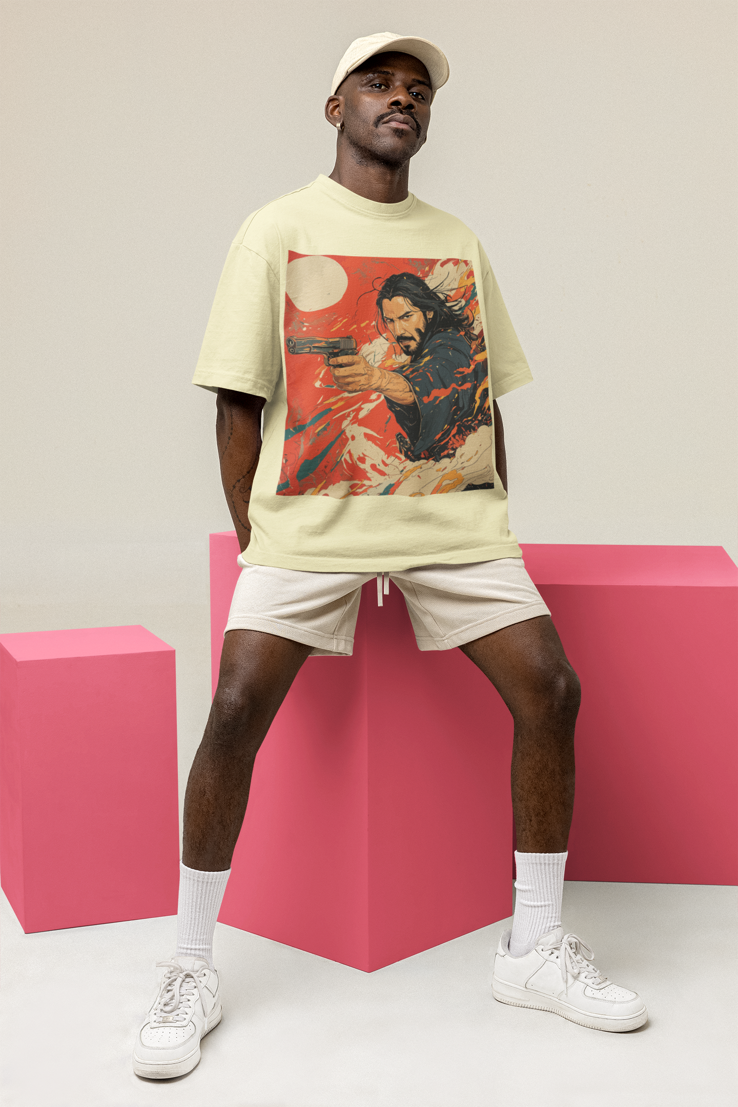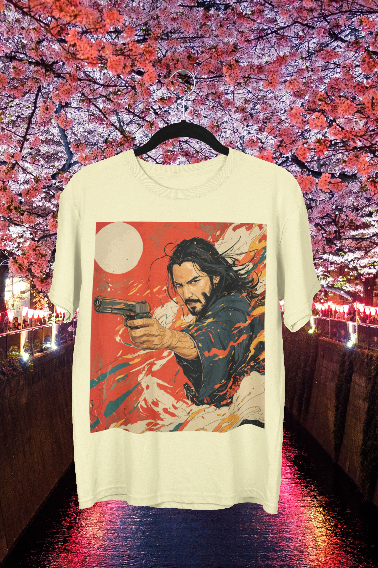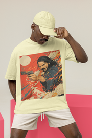 Printed on a soft off-white base and crafted from premium compact cotton, this oversized silhouette pairs comfort with commanding presence. The artwork features a brooding, long-haired warrior mid-action, weapon drawn, surrounded by swirling brushstrokes of red, white, and orange—evoking both ink painting and explosion. A pale rising sun anchors the design in Japanese symbolism, while the electric composition adds a modern, rebellious twist.