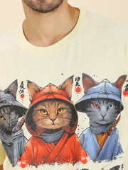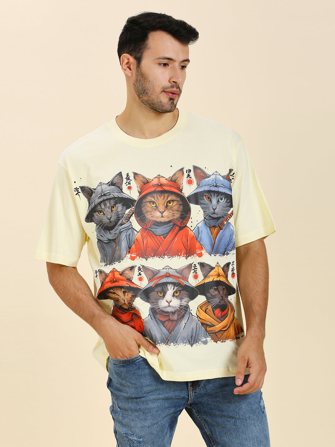 This limited edition drop features six sharply dressed feline warriors, each with their own samurai style, poised in vibrant armor and full attitude. Printed on a soft pastel lemon base and crafted from premium compact cotton, this oversized silhouette serves up cloud-soft comfort and bold visual contrast in one seamless piece.