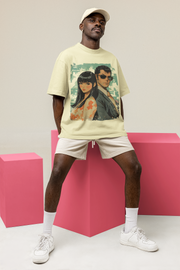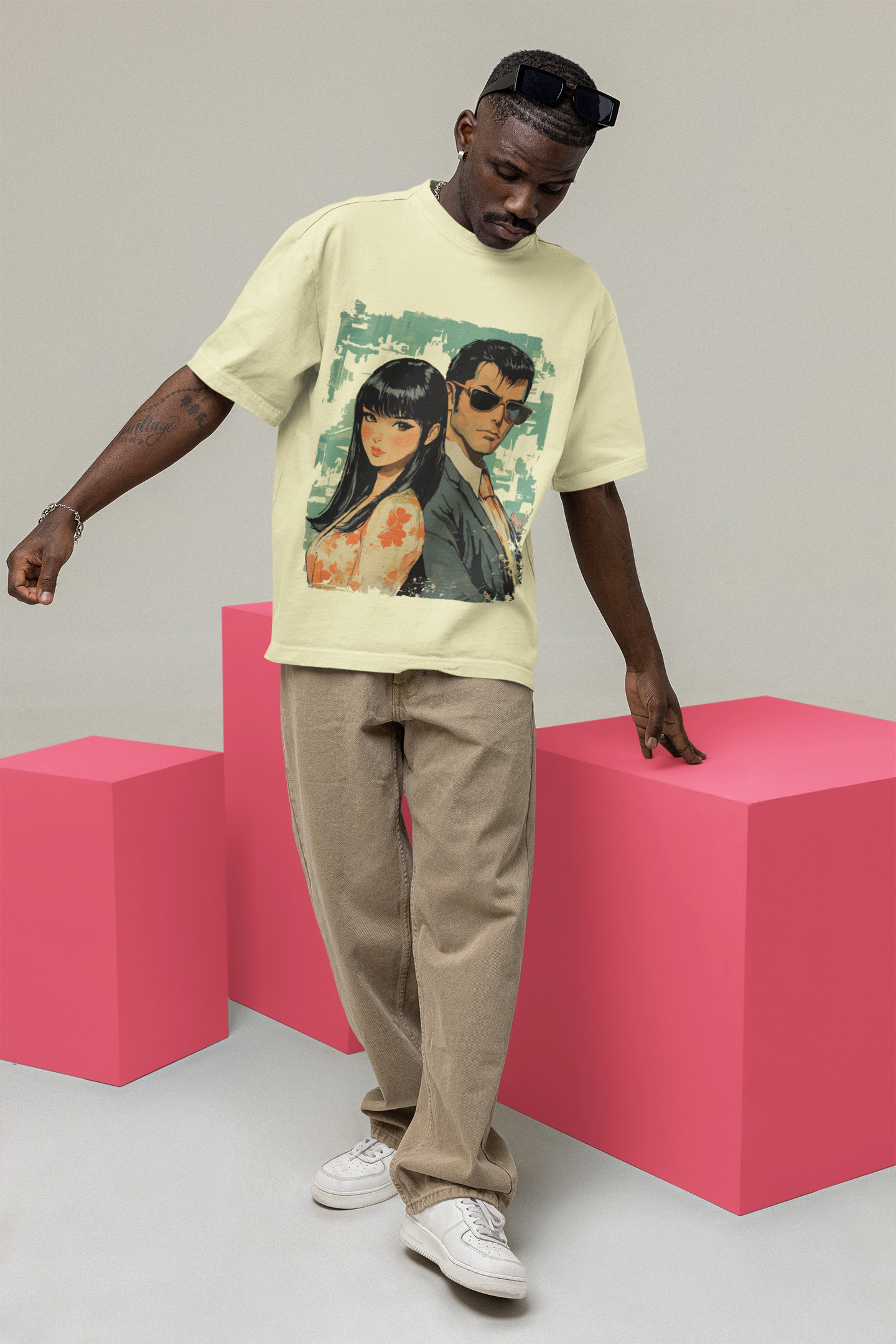 Printed on an off-white oversized canvas of premium compact cotton, the artwork pairs a sleek, suited agent with slicked-back hair and dark shades, alongside a femme fatale in a floral kimono-style dress. The brushstroke-style background adds a painterly texture, nodding to retro manga covers and pulp thrillers.