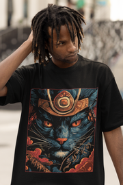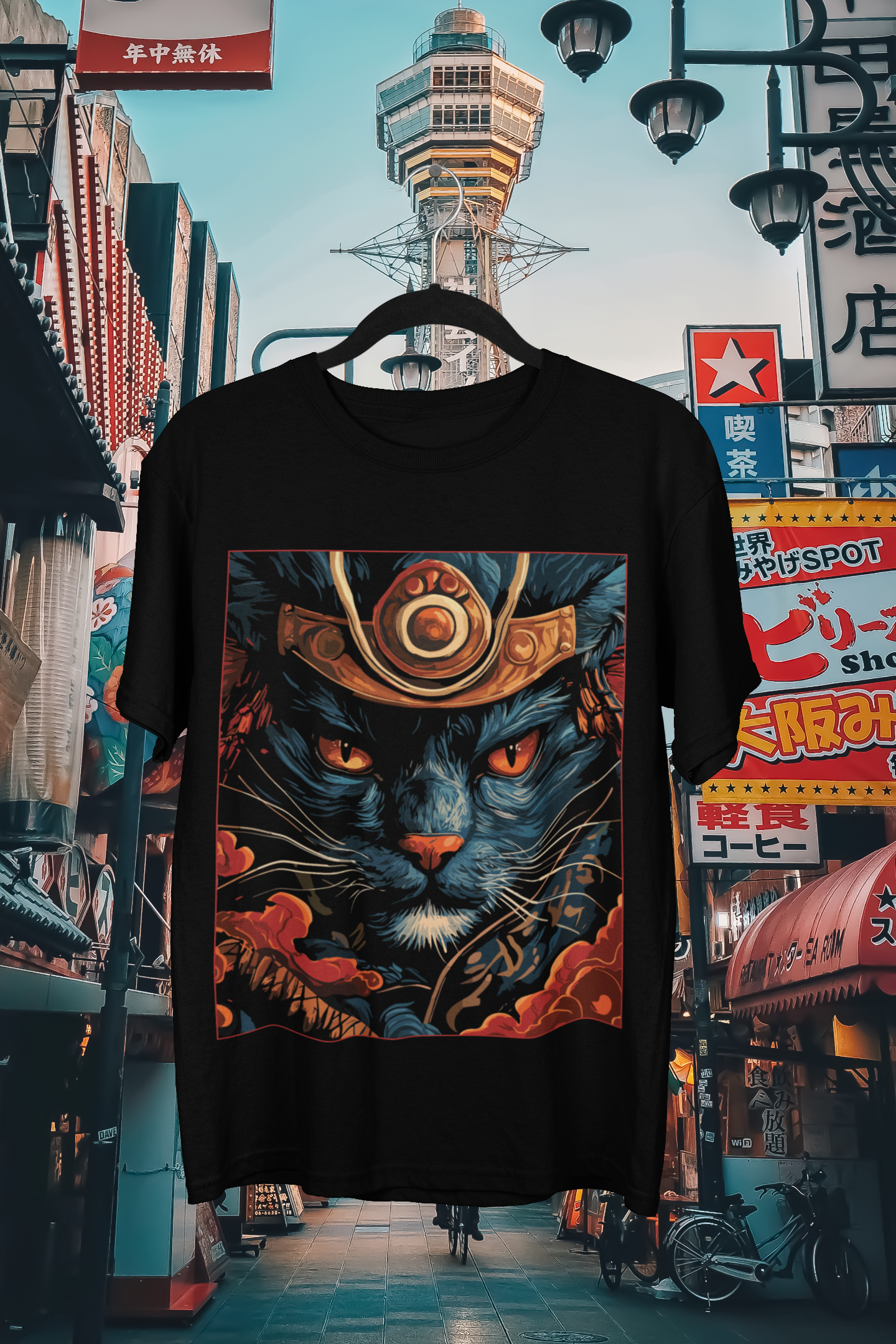 Emperor’s Gaze channels regal power and mythical intensity with a richly detailed portrait of a samurai cat in ceremonial armor. Deep reds, bold golds, and hypnotic eyes make this piece equal parts streetwear and art gallery.