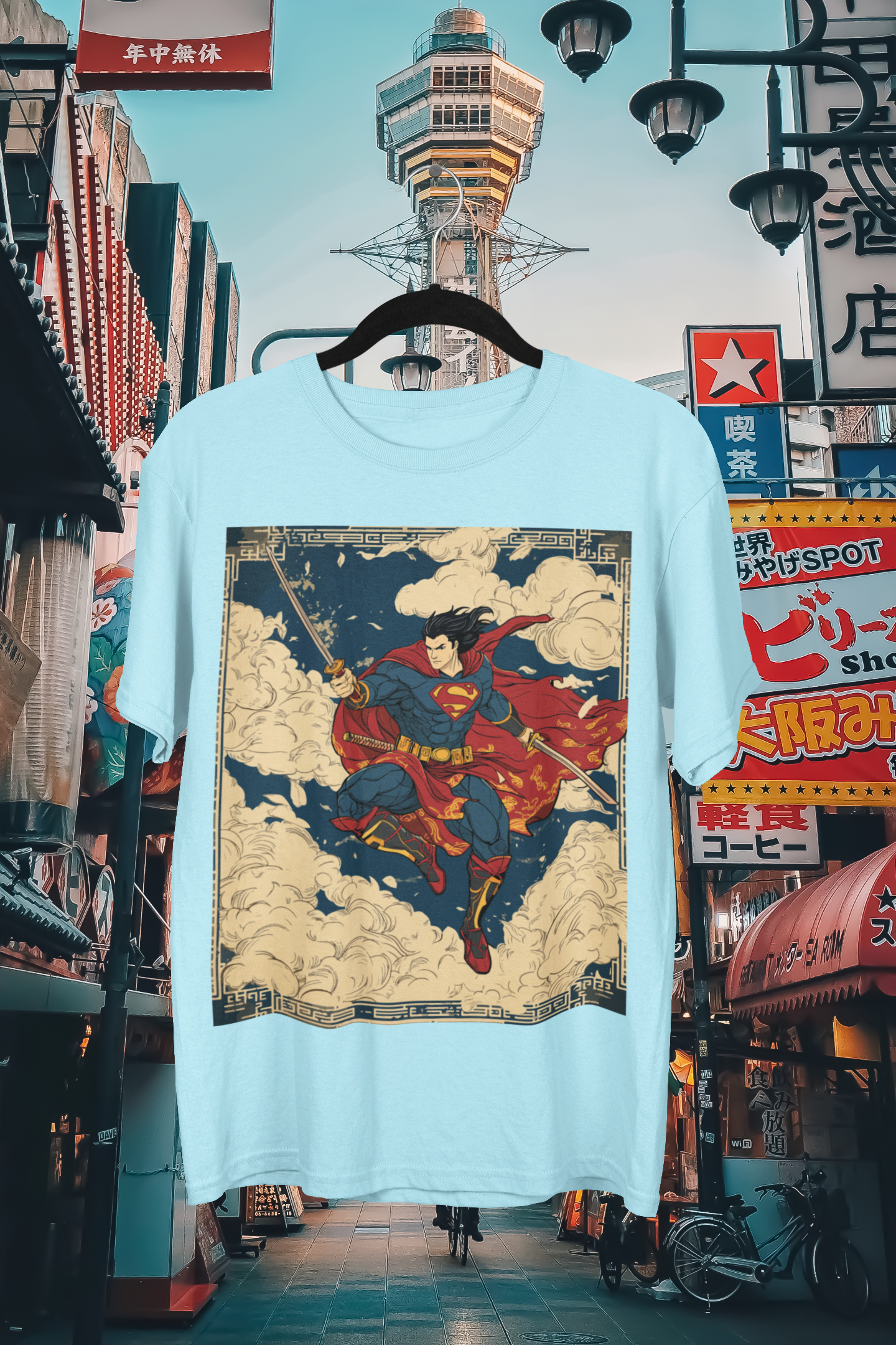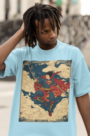 Set against swirling clouds and framed in ornate golden motifs, this ice blue oversized tee features a heroic figure in red and blue robes, sword drawn mid-flight, channeling the iconic "S" with a divine twist. Crafted from ultra-soft, premium compact cotton, the shirt’s relaxed silhouette and bold visual language make it both a wearable artwork and a conversation starter.