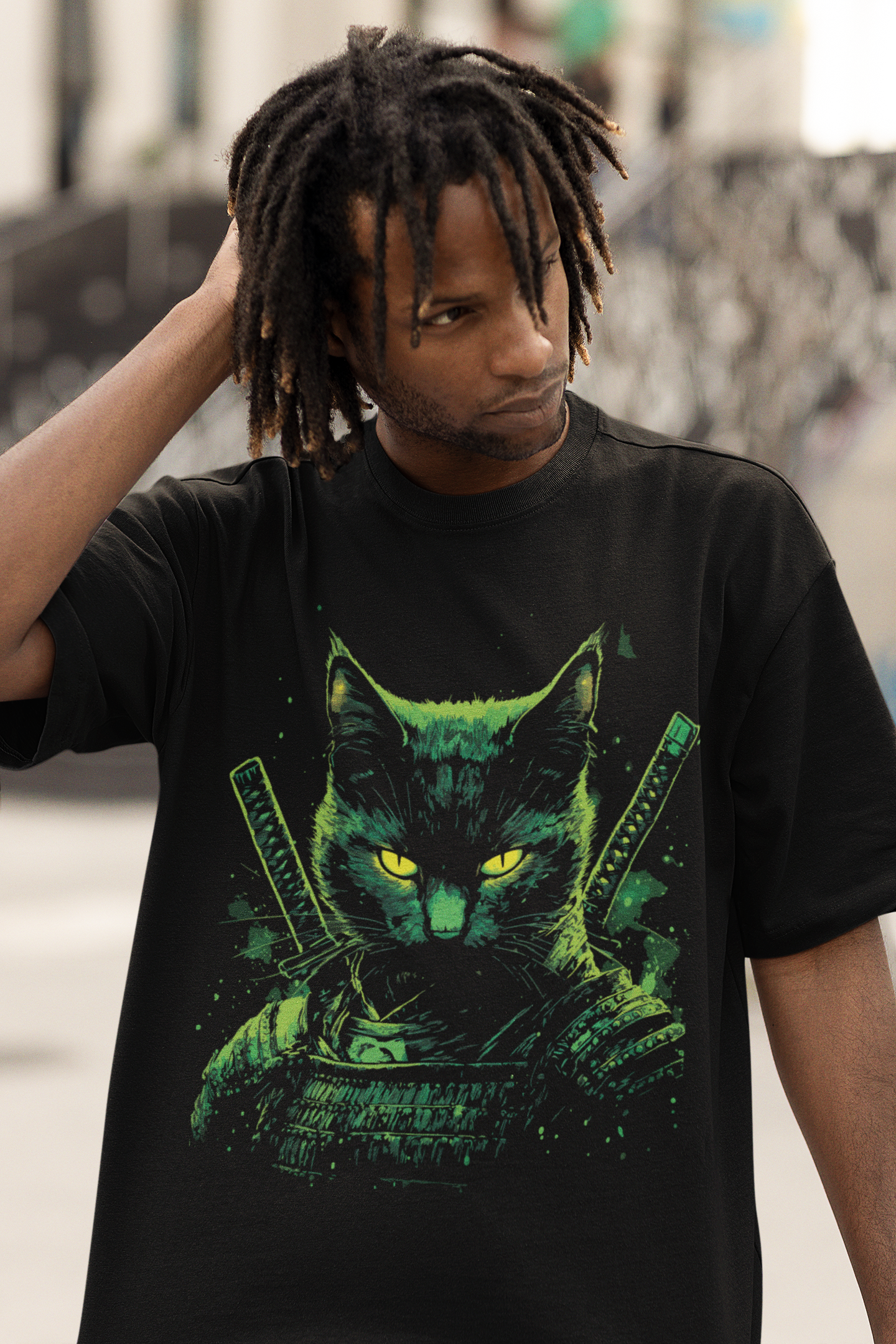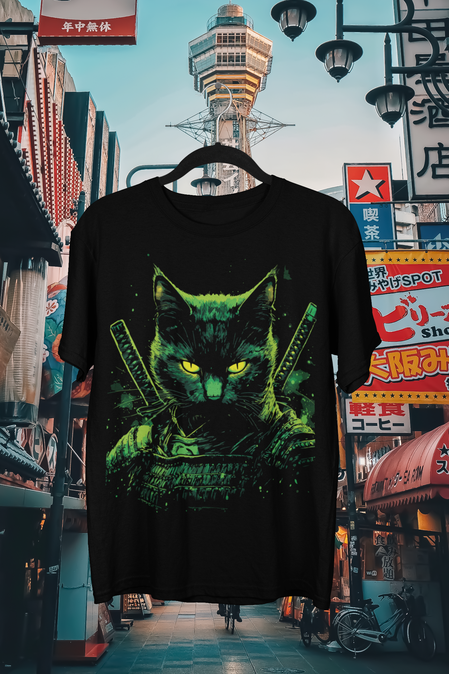 Stealth never looked this good. Shinobi Cat features a neon-lit black cat in full samurai armor, twin katanas strapped to its back, and eyes that cut through darkness. Glowing green art against black cotton, this tee is lethal and legendary.