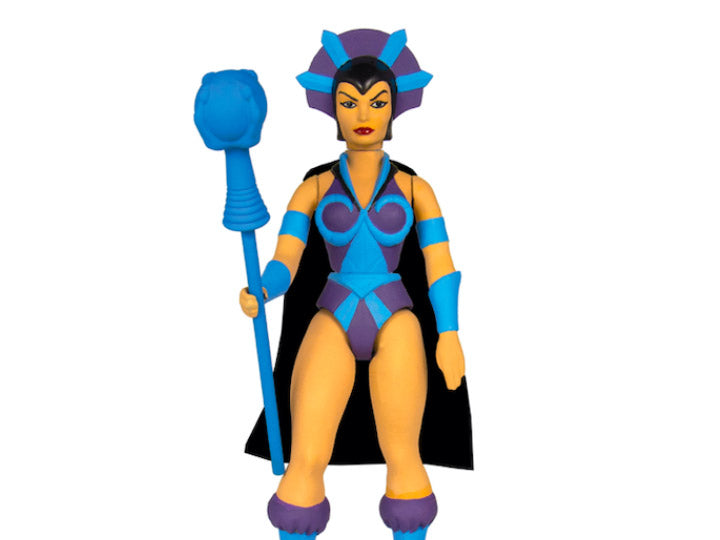 From He-Man and the Masters of the Universe, the Evil-Lyn 5.5-inch Vintage Figure comes with Staff, Crystal Ball, Corodite Crystal, and cape accessories and features a spring loaded mechanism: Turn the waist and he swings back with a punch! The packaging includes a custom character history card with the figure and has new and original art on the back of each card.
